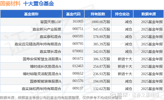 重仓国瓷材料的前十大公募基金请见下表: