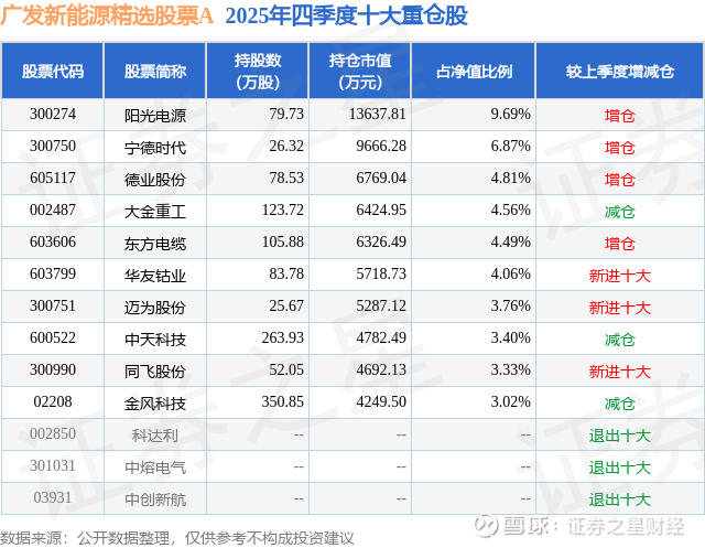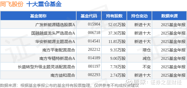 根据2025基金年报公募基金重仓股数据,重仓该股的公募基金共7家,其中持有数量最多的公募基金为广发基金的广发新能源精选股票A。广发新能源精选股票A目前规模为6.09亿元,最新净值1.1969(2月2日),较上一交易日下跌1.64%,近一年上涨46.37%。该公募基金现任基金经理为郑澄然 毛昆。郑澄然在任的基金产品包括:广发鑫享灵活配置混合A,管理时间为2020年5月20日至今,期间收益率为56.36%;广发高端制造股票A,管理时间为2020年7月23日至今,期间收益率为-28.35%;广发兴诚混合A,管理时间为2021年1月6日至今,期间收益率为-49.52%;广发诚享混合A,管理时间为2021年2月8日至今,期间收益率为-48.32%。
