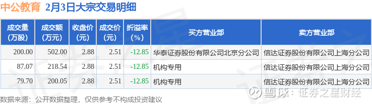 证券之星消息,2月3日中公教育发生大宗交易,交易数据如下: