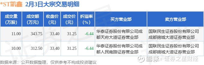 证券之星消息,2月3日*ST凯鑫发生大宗交易,交易数据如下: