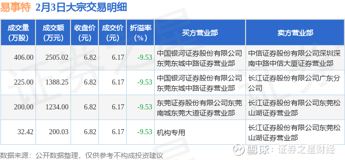 证券之星消息,2月3日易事特发生大宗交易,交易数据如下: