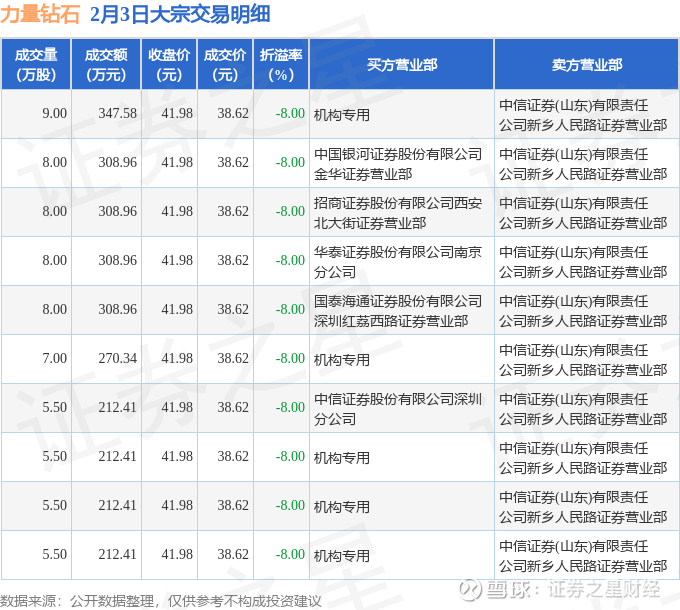 证券之星消息,2月3日力量钻石发生大宗交易,交易数据如下: