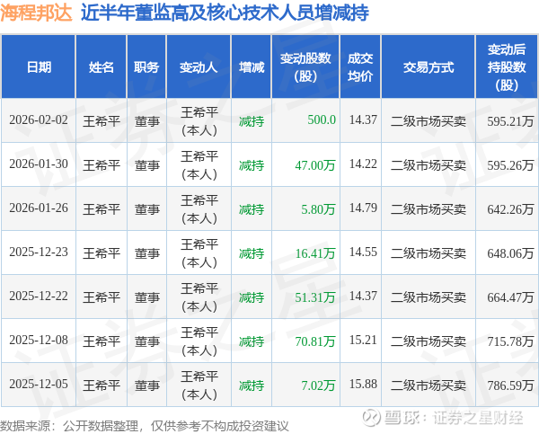 证券之星消息,根据2月3日市场公开信息、上市公司公告及交易所披露数据整理,海程邦达(603836)最新董监高及相关人员股份变动情况:2026年2月2日公司董事王希平共减持公司股份500.0股,占公司总股本为0.0002%。变动期间公司股价下跌1.13%,2月2日当日收盘报14.06元。