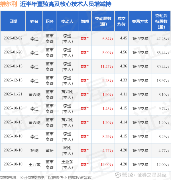 维尔利近半年内的董监高及核心技术人员增减持详情如下: