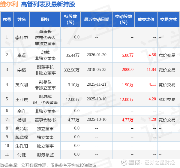维尔利的高管列表及最新持股情况如下: