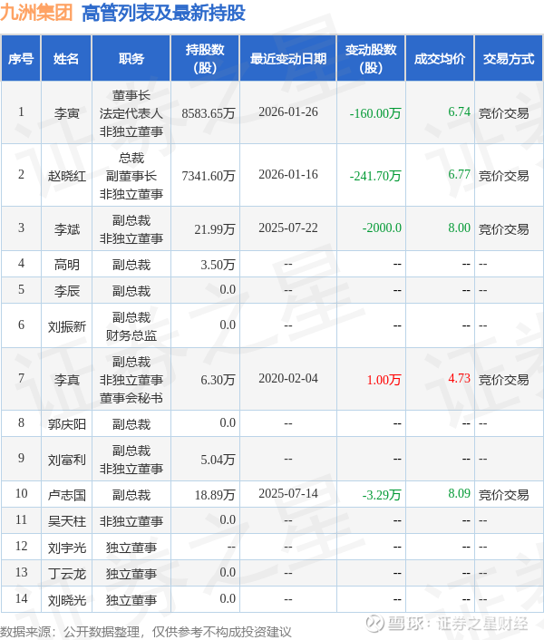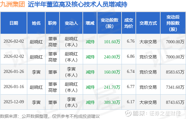 九洲集团近半年内的董监高及核心技术人员增减持详情如下: