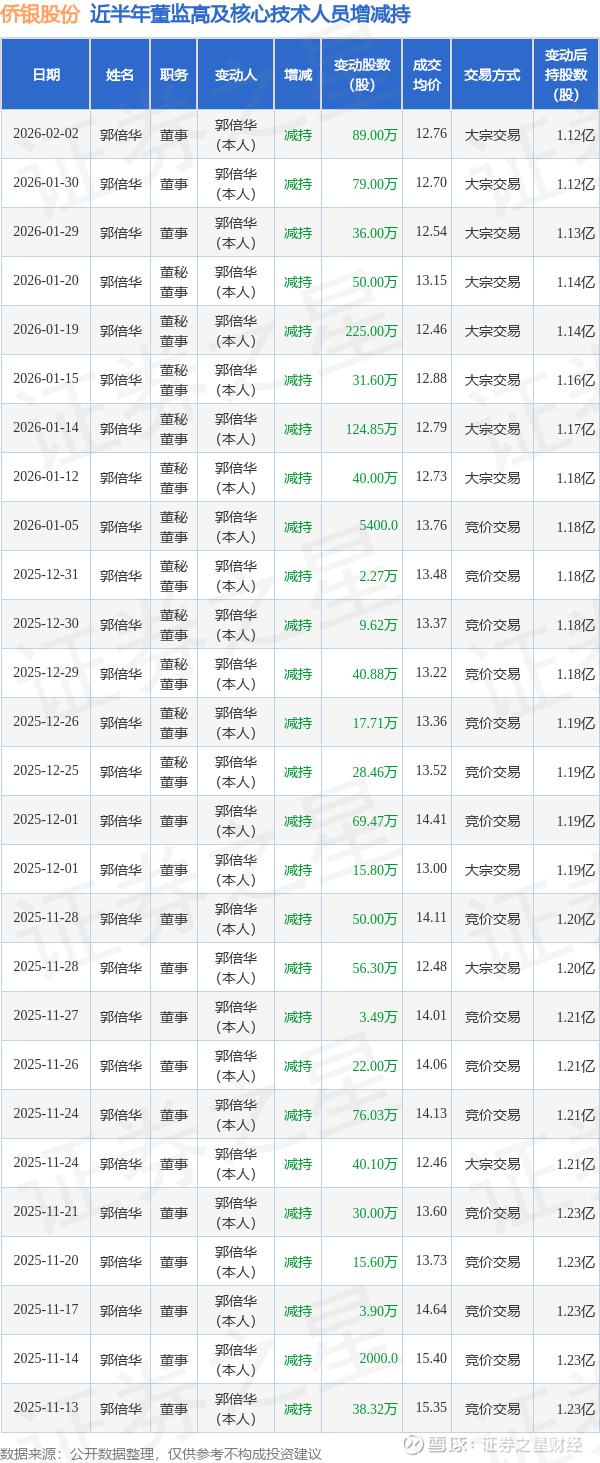 侨银股份近半年内的董监高及核心技术人员增减持详情如下: