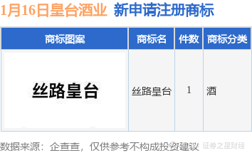 证券之星消息,根据天眼查APP数据显示,近日甘肃皇台酒业股份有限公司新提交“丝路皇台”商标注册申请。商标申请详情如下: