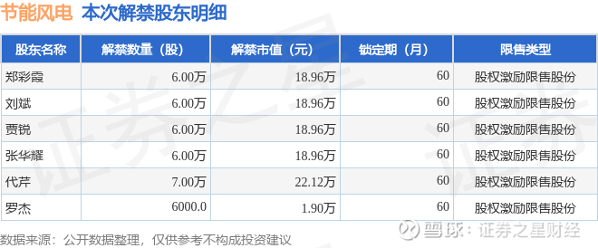 证券之星消息,根据市场公开信息整理,节能风电(601016)于2月4日将有31.6万股限售股份解禁,为公司股权激励限售股份,占公司总股本0.0%。(本次数据根据历史公告整理得出,实际情况以上市公司最新公告为准)最近一年内,该股累计解禁718.78万股,占总股本的0.11%。本次解禁后,公司还有5.06亿股限售股份,占总股本7.86%。具体如下图所示: