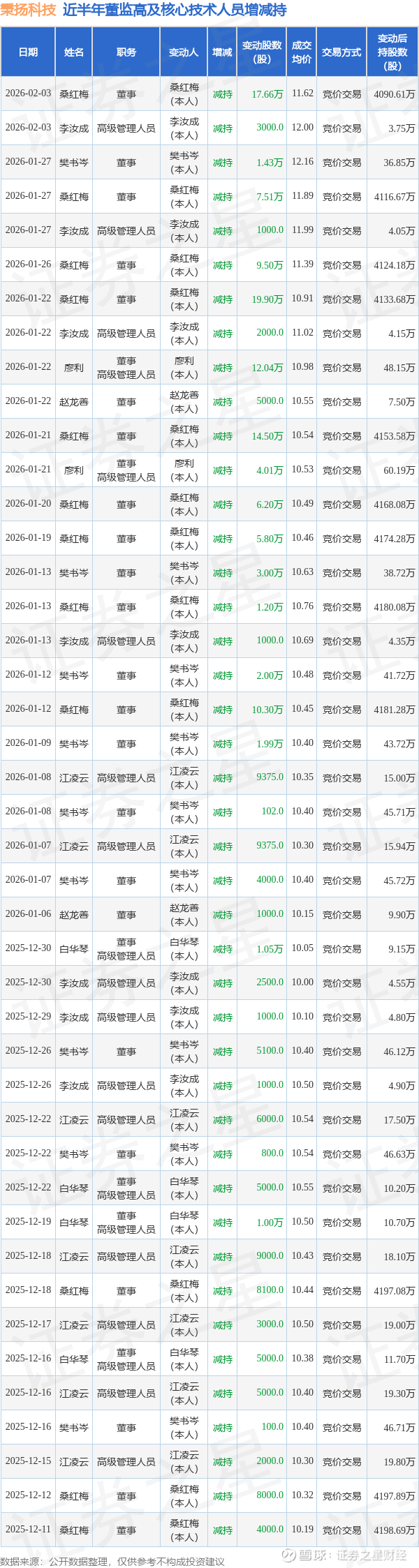 秉扬科技近半年内的董监高及核心技术人员增减持详情如下: