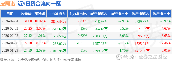 2月4日的资金流向数据方面,主力资金净流入3608.43万元,占总成交额12.83%,游资资金净流出818.56万元,占总成交额2.91%,散户资金净流出2789.87万元,占总成交额9.92%。