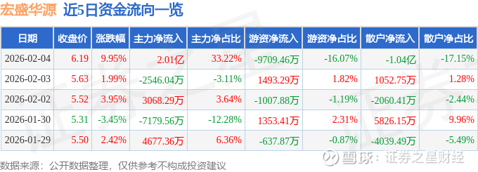 证券之星消息,宏盛华源2月4日涨停收盘,收盘价6.19元。该股于9点36分涨停,1次打开涨停,截止收盘封单资金为2.2亿元,占其流通市值2.16%。