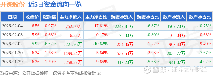 证券之星消息,开滦股份2月4日涨停收盘,收盘价6.56元。该股于14点42分涨停,未打开涨停,截止收盘封单资金为3652.46万元,占其流通市值0.35%。