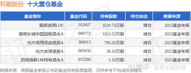 根据2025基金年报公募基金重仓股数据,重仓该股的公募基金共5家,其中持有数量最多的公募基金为景顺长城基金的景顺资源LOF。景顺资源LOF目前规模为16.99亿元,最新净值0.586(2月3日),较上一交易日上涨2.45%,近一年上涨41.55%。该公募基金现任基金经理为韩文强。韩文强在任的基金产品包括:景顺长城中国回报混合A,管理时间为2019年10月10日至今,期间收益率为77.9%;景顺长城安鑫回报一年持有期混合A,管理时间为2020年7月10日至今,期间收益率为9.26%;景顺长城致远混合A,管理时间为2023年2月28日至今,期间收益率为-9.65%。