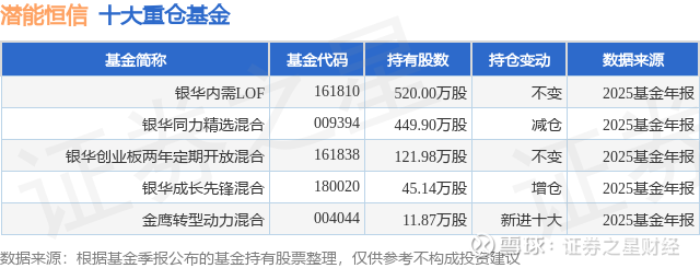 根据2025基金年报公募基金重仓股数据,重仓该股的公募基金共5家,其中持有数量最多的公募基金为银华基金的银华内需LOF。银华内需LOF目前规模为16.85亿元,最新净值5.341(2月3日),较上一交易日上涨1.6%,近一年上涨112.96%。该公募基金现任基金经理为王利刚。王利刚在任的基金产品包括:银华成长先锋混合,管理时间为2019年12月31日至今,期间收益率为59.27%;银华创业板两年定期开放混合,管理时间为2020年8月7日至今,期间收益率为-3.88%;银华同力精选混合,管理时间为2021年4月26日至今,期间收益率为68.32%;