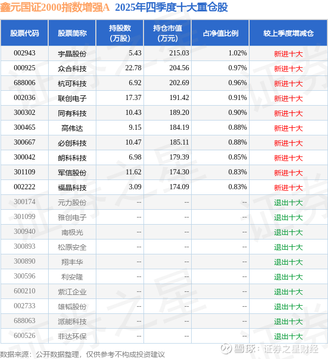 鑫元国证2000指数增强A的前十大重仓股如下: