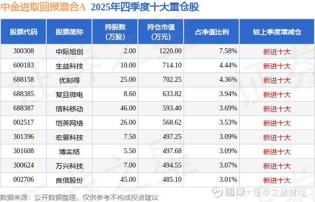根据2025基金年报公募基金重仓股数据,重仓该股的公募基金共4家,其中持有数量最多的公募基金为中金基金的中金进取回报混合A。中金进取回报混合A目前规模为1.14亿元,最新净值1.2883(2月3日),较上一交易日上涨3.29%。该公募基金现任基金经理为于质冰。于质冰在任的基金产品包括:中金衡优灵活配置混合A,管理时间为2025年4月25日至今,期间收益率为6.61%;中金安心回报混合A,管理时间为2025年11月17日至今,期间收益率为1.65%;中金丰裕稳健一年持有混合A,管理时间为2025年11月17日至今,期间收益率为1.4%。