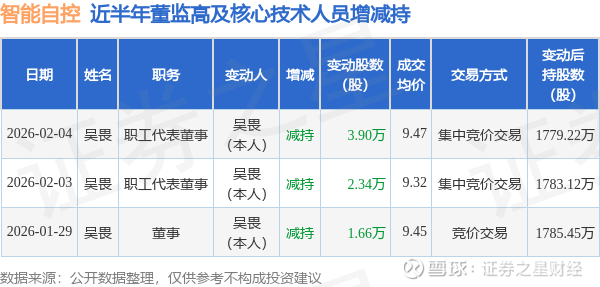 证券之星消息,根据2月4日市场公开信息、上市公司公告及交易所披露数据整理,智能自控(002877)最新董监高及相关人员股份变动情况:2026年2月3日至2026年2月4日公司职工代表董事吴畏共减持公司股份6.24万股,占公司总股本为0.0176%。变动期间公司股价上涨1.84%,2月3日当日收盘报9.41元。
