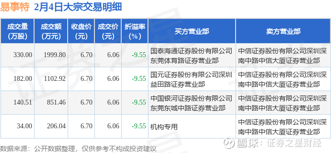 证券之星消息,2月4日易事特发生大宗交易,交易数据如下: