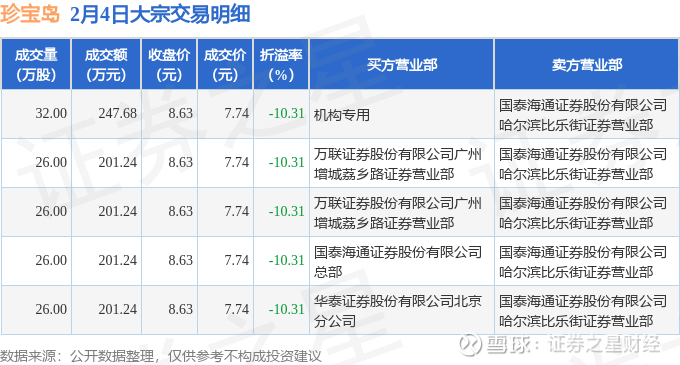 证券之星消息,2月4日珍宝岛发生大宗交易,交易数据如下: