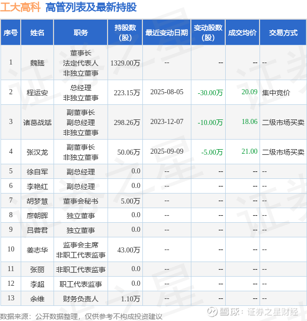 工大高科近半年内的董监高及核心技术人员增减持详情如下: