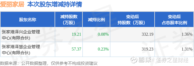 证券之星消息,2月4日爱丽家居发布公告《爱丽家居:爱丽家居科技股份有限公司关于控股股东及其一致行动人权益变动触及1%刻度的提示性公告》,其股东张家港泽兴企业管理中心(有限合伙)、张家港泽慧企业管理中心(有限合伙)于2026年1月30日至2026年2月4日间合计减持76.58万股,占公司目前总股本的0.3132%,变动期间该股股价上涨2.64%,截止2月4日收盘报13.24元。