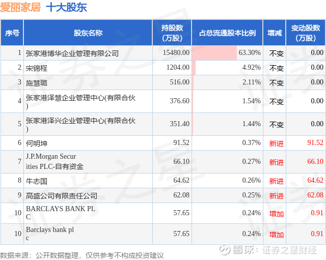 根据爱丽家居2025年三季报公布的十大股东详情如下: