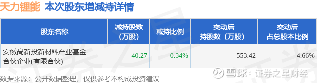 证券之星消息,2月4日天力锂能发布公告《天力锂能:天力锂能集团股份有限公司关于股东减持计划期限届满暨实施结果的公告》,其股东安徽高新投新材料产业基金合伙企业(有限合伙)于2025年11月8日至2025年12月26日间合计减持40.27万股,占公司目前总股本的0.3391%,变动期间该股股价下跌6.62%,截止12月26日收盘报32.29元。