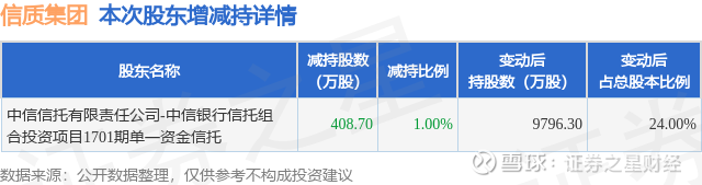 证券之星消息,2月4日信质集团发布公告《信质集团:关于第一大股东权益变动触及1%整数倍的公告》,其股东中信信托有限责任公司-中信银行信托组合投资项目1701期单一资金信托于2025年12月11日至2026年2月4日间合计减持408.7万股,占公司目前总股本的1.0012%,变动期间该股股价上涨15.67%,截止2月4日收盘报26.72元。