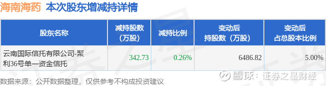 证券之星消息,2月4日海南海药发布公告《海南海药:简式权益变动报告书(云南国际信托有限公司-聚利36号单一资金信托)》,其股东云南国际信托有限公司-聚利36号单一资金信托于2026年2月2日合计减持342.73万股,占公司目前总股本的0.2642%,变动期间该股股价下跌3.87%,截止2月2日收盘报6.21元。