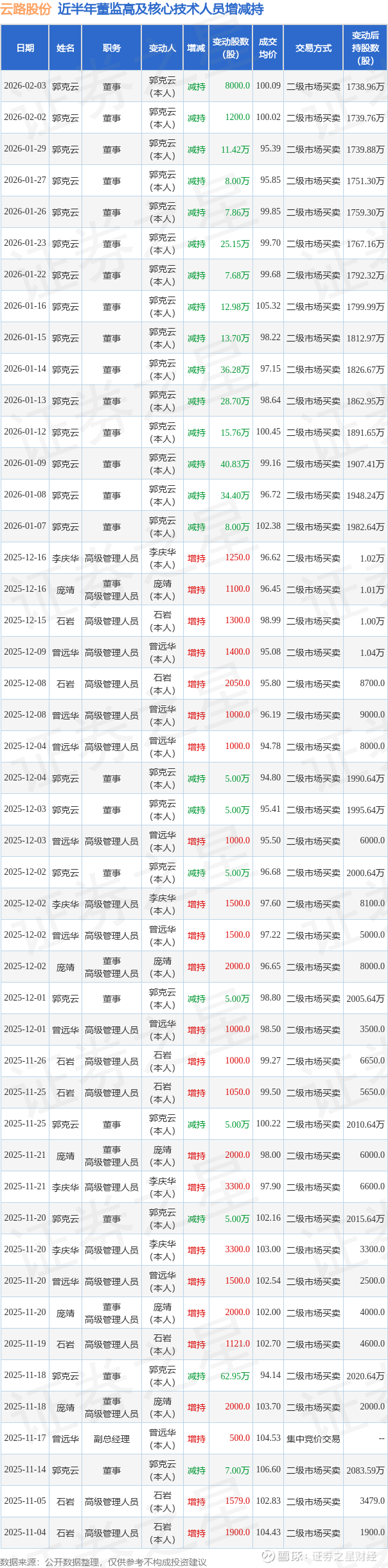 云路股份近半年内的董监高及核心技术人员增减持详情如下: