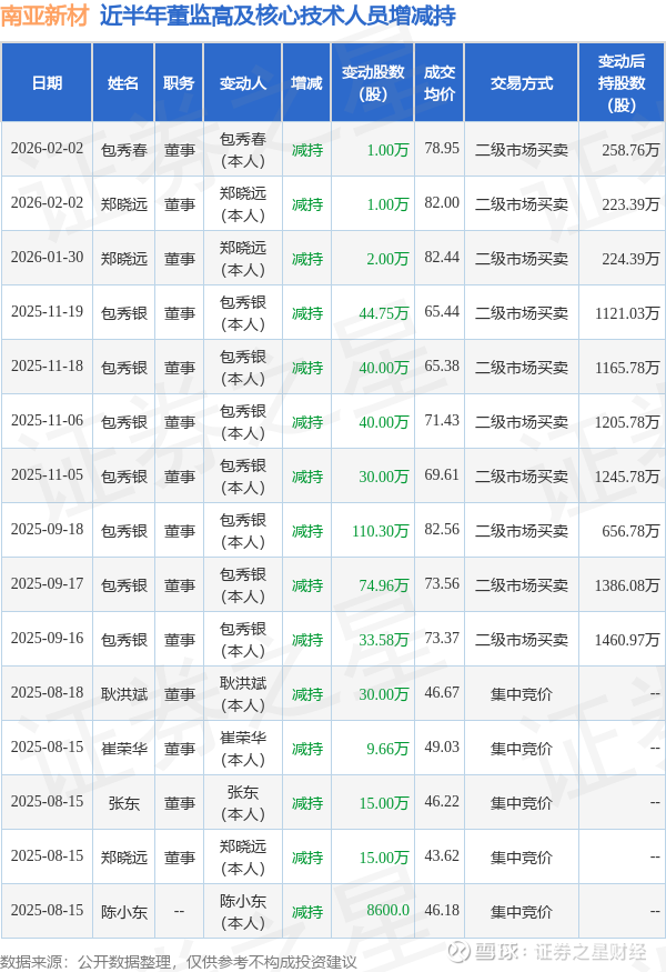 南亚新材近半年内的董监高及核心技术人员增减持详情如下:
