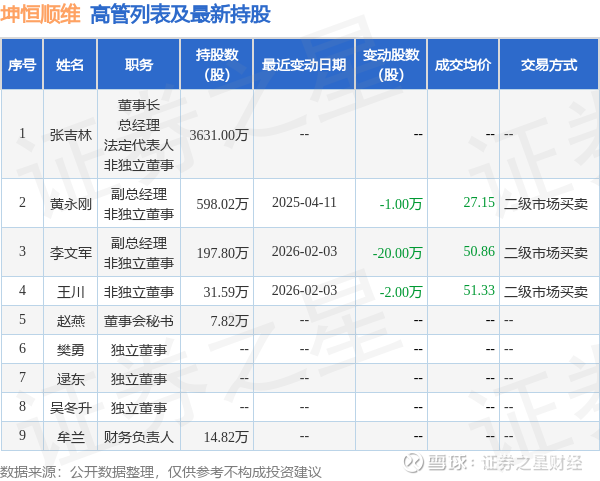 坤恒顺维的高管列表及最新持股情况如下: