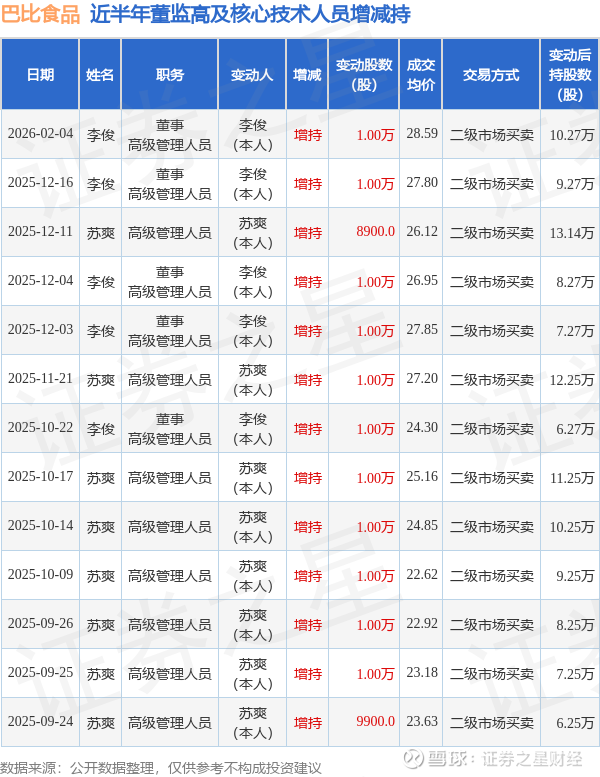 巴比食品近半年内的董监高及核心技术人员增减持详情如下: