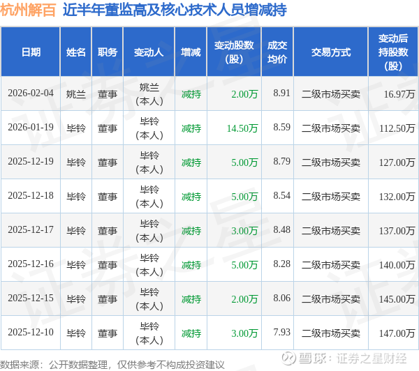 杭州解百近半年内的董监高及核心技术人员增减持详情如下: