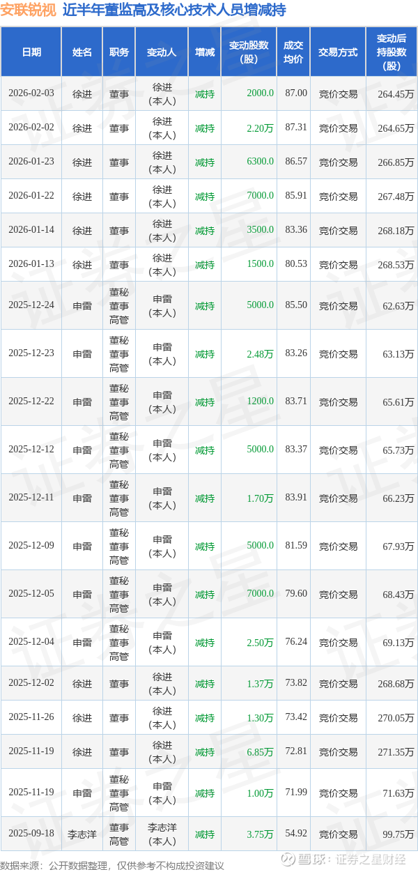 安联锐视近半年内的董监高及核心技术人员增减持详情如下: