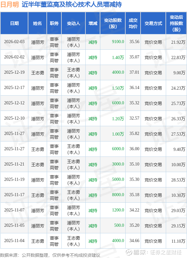 日月明近半年内的董监高及核心技术人员增减持详情如下: