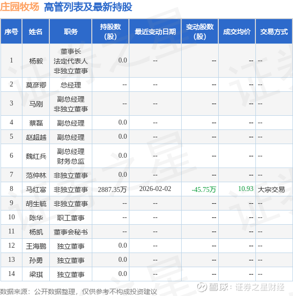 庄园牧场近半年内的董监高及核心技术人员增减持详情如下: