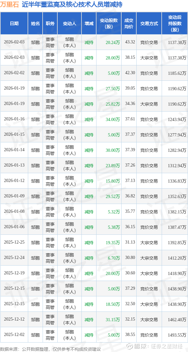万里石近半年内的董监高及核心技术人员增减持详情如下:
