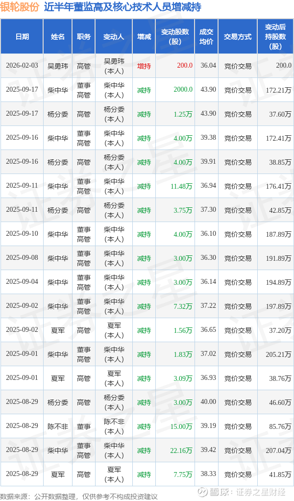 银轮股份近半年内的董监高及核心技术人员增减持详情如下: