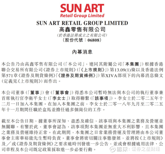 而在早间,高鑫零售在港交所发布公告称,暂时无法与执行董事兼首席执行官李卫平取得联系。并表示,该事项对本集团并无重大不利影响,且集团之业务及营运维持正常。在此期间,集团之日常业务营运及管理将由公司董事会主席华裕能暂时负责。