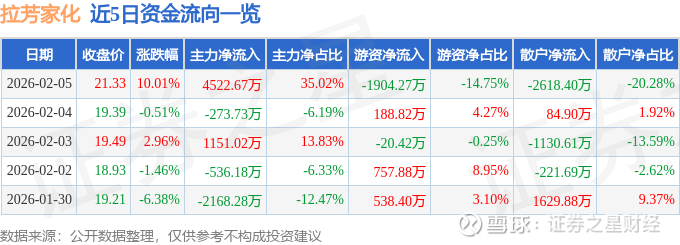 证券之星消息,拉芳家化2月5日涨停收盘,收盘价21.33元。该股于9点53分涨停,未打开涨停,截止收盘封单资金为7485.12万元,占其流通市值1.56%。