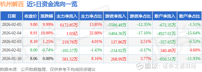 证券之星消息,杭州解百2月5日涨停收盘,收盘价9.8元。该股于9点51分涨停,未打开涨停,截止收盘封单资金为1.24亿元,占其流通市值1.72%。