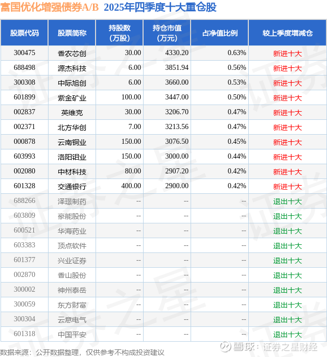 根据2025基金年报公募基金重仓股数据,重仓该股的公募基金共8家,其中持有数量最多的公募基金为富国基金的富国优化增强债券A/B。富国优化增强债券A/B目前规模为18.38亿元,最新净值2.173(2月4日),较上一交易日下跌0.05%,近一年上涨20.66%。该公募基金现任基金经理为张育浩。张育浩在任的基金产品包括:富国悦享回报12个月持有期混合A,管理时间为2021年12月30日至今,期间收益率为24.29%;富国稳健双盈债券发起式A,管理时间为2022年12月21日至今,期间收益率为10.56%;富国双利增强债券A,管理时间为2025年2月26日至今,期间收益率为12.72%;富国稳健添利债券A,管理时间为2025年11月4日至今,期间收益率为3.36%。
