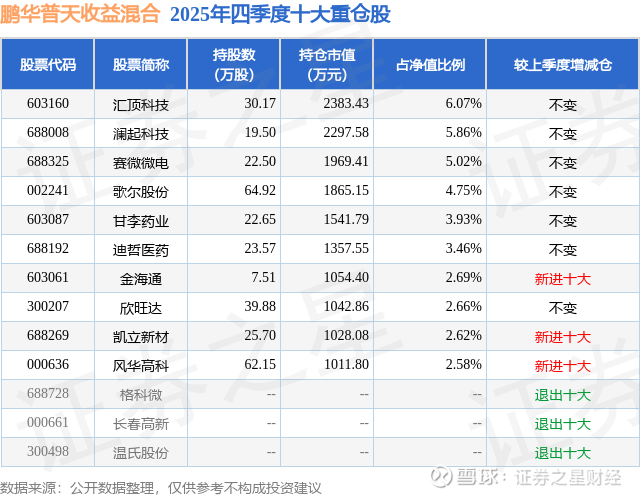 根据2025基金年报公募基金重仓股数据,重仓该股的公募基金共1家,其中持有数量最多的公募基金为鹏华基金的鹏华普天收益混合。鹏华普天收益混合目前规模为3.92亿元,最新净值2.7(2月4日),较上一交易日下跌0.18%,近一年上涨30.65%。该公募基金现任基金经理为蒋鑫。蒋鑫在任的基金产品包括:鹏华健康环保混合,管理时间为2016年6月24日至今,期间收益率为129.31%;鹏华优选成长混合A,管理时间为2020年12月16日至今,期间收益率为-11.72%;鹏华远见成长混合A,管理时间为2021年6月2日至今,期间收益率为-6.28%。
