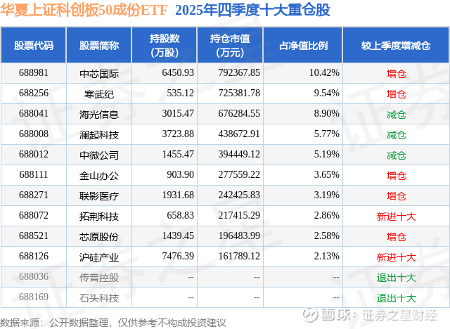 华夏上证科创板50成份ETF的前十大重仓股如下: