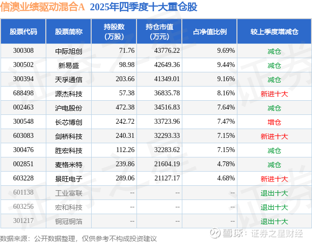 根据2025基金年报公募基金重仓股数据,重仓该股的公募基金共238家,其中持有数量最多的公募基金为信达澳亚基金的信澳业绩驱动混合A。信澳业绩驱动混合A目前规模为9.21亿元,最新净值1.8923(2月4日),较上一交易日下跌1.97%,近一年上涨136.33%。该公募基金现任基金经理为刘小明。