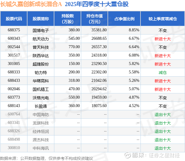 长城久嘉创新成长混合A的前十大重仓股如下: