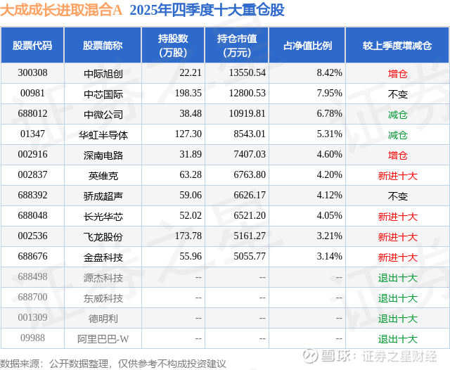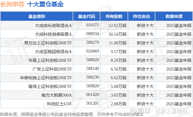 根据2025基金年报公募基金重仓股数据,重仓该股的公募基金共20家,其中持有数量最多的公募基金为大成基金的大成成长进取混合A。大成成长进取混合A目前规模为5.92亿元,最新净值1.9134(2月4日),较上一交易日下跌0.6%,近一年上涨72.55%。该公募基金现任基金经理为杜聪。杜聪在任的基金产品包括:大成科技消费股票A,管理时间为2024年12月27日至今,期间收益率为57.24%;大成至臻回报混合A,管理时间为2025年6月25日至今,期间收益率为36.71%。