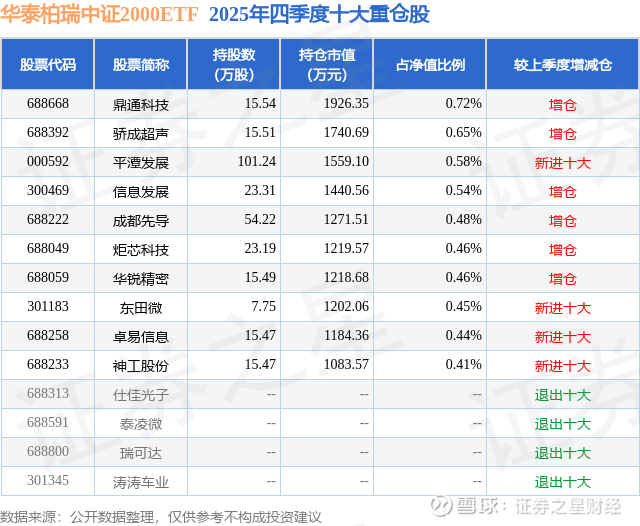 根据2025基金年报公募基金重仓股数据,重仓该股的公募基金共4家,其中持有数量最多的公募基金为华泰柏瑞基金的华泰柏瑞中证2000ETF。华泰柏瑞中证2000ETF目前规模为26.75亿元,最新净值1.4925(2月4日),较上一交易日上涨0.11%,近一年上涨48.42%。该公募基金现任基金经理为柳军 李沐阳。柳军在任的基金产品包括:华泰柏瑞上证红利ETF,管理时间为2009年6月4日至今,期间收益率为148.51%;华泰柏瑞沪深300ETF,管理时间为2012年5月4日至今,期间收益率为119.39%;华泰柏瑞沪深300ETF联接A,管理时间为2012年5月29日至今,期间收益率为136.25%;华泰MSCI中国A股国际通ETF,管理时间为2018年4月26日至今,期间收益率为87.71%。李沐阳在任的基金产品包括:华泰柏瑞中证光伏产业ETF,管理时间为2021年1月6日至今,期间收益率为-3.64%;华泰柏瑞光伏ETF联接A,管理时间为2021年8月17日至今,期间收益率为-29.57%;华泰柏瑞中韩半导体ETF(QDII),管理时间为2022年11月2日至今,期间收益率为214.59%;华泰柏瑞纳斯达克100ETF(QDII),管理时间为2023年3月1日至今,期间收益率为102.61%。